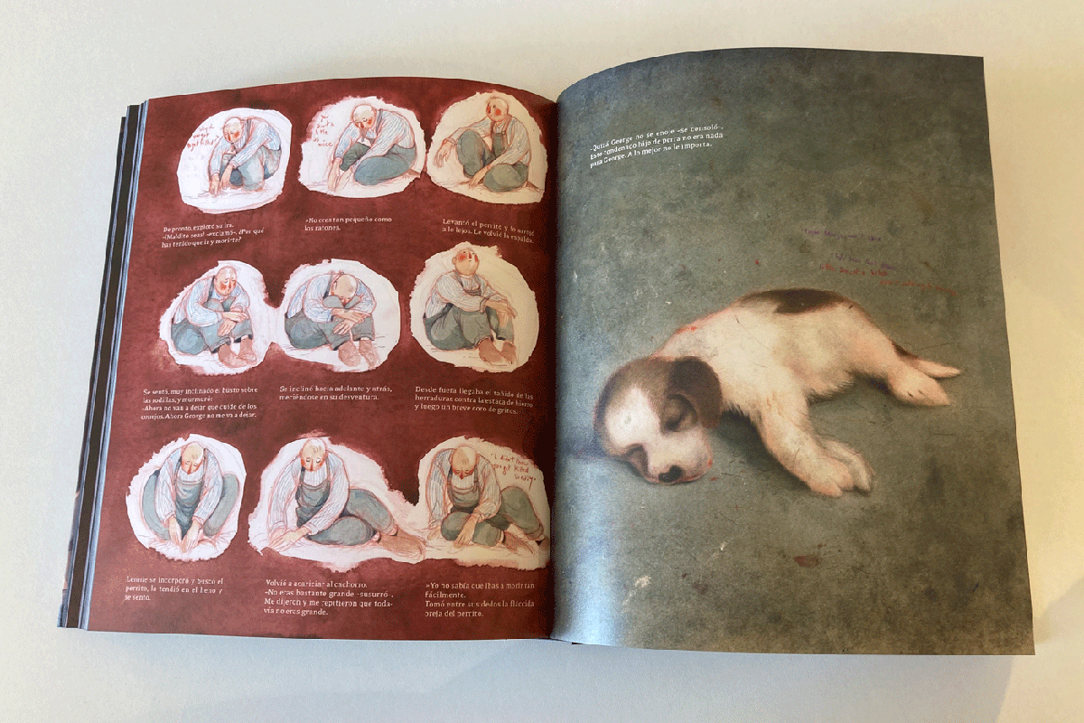 Pero Dautremer se aparta del camino más clásico y, haciendo uso del humor, intercala imágenes cómicas, anuncios de la época y, en ocasiones, dibujos infantiles producto de la imaginación de Lennie o imágenes pornográficas soñadas por Georges. Con ella entramos en el rancho, los burdeles, los teatros o en las plantaciones de algodón. Todos son escenarios meticulosamente recreados. La artista nos obliga a demorarnos en los detalles, a veces extraños, y en escenas surrealistas como la del grandullón Lennie descansando sobre una enorme judía o la de George, derrotado, flotando en un mar rojo de salsa de tomate. Dautremer convierte el texto en una moderna novela gráfica para adultos.