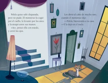Pelela, un cachorro de gata, está aterrorizada desde que un terrible monstruo de orejas pequeñas se la llevó a su casa y se busca un escondite. Tan solo sale de él para comerse el suculento alimento que le preparan.