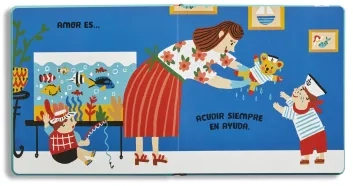 Está diseñado en cartón, con solapas y esquinas redondeadas, muy adecuado para niños pequeños. Está escrito con letra mayúscula para facilitar la lectura.